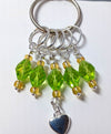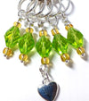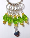 Fine Crystal Stitch Markers - Green and Gold with Silver Heart