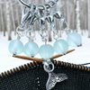 Set of 5 frosted seafoam fine glass stitch markers on silver rings that fit most knitting needles. One has a silver mermaid tail charm. The glass reflects the light beautifully like suncatchers as you craft. Includes a ring for storage.  Add some elegance and whimsy to your knitting!