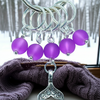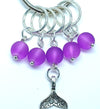 Set of 5 frosted purple fine glass stitch markers on silver rings that fit most knitting needles. One has a silver mermaid tail charm. The glass reflects the light beautifully like suncatchers as you craft. Includes a ring for storage.  Add some elegance and whimsy to your knitting!