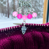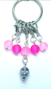 Set of 5 frosted light pink and bright pink fine glass stitch markers on silver rings that fit most knitting needles. One has a silver glass skull charm. The glass reflects the light beautifully like suncatchers as you craft. Includes a ring for storage.  Add some elegance and whimsy to your knitting!