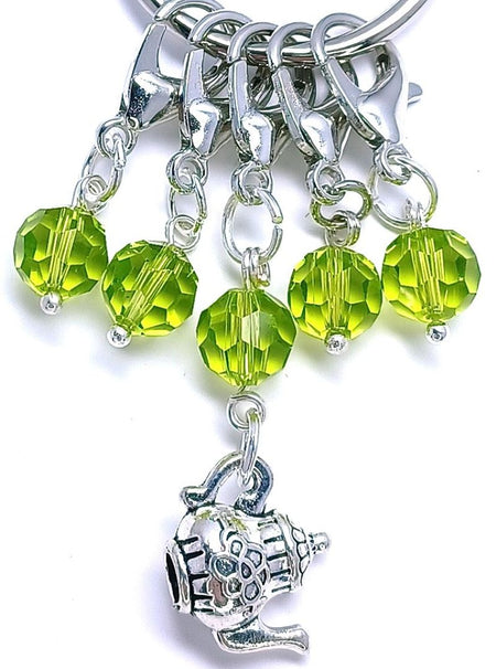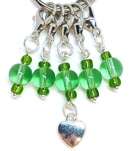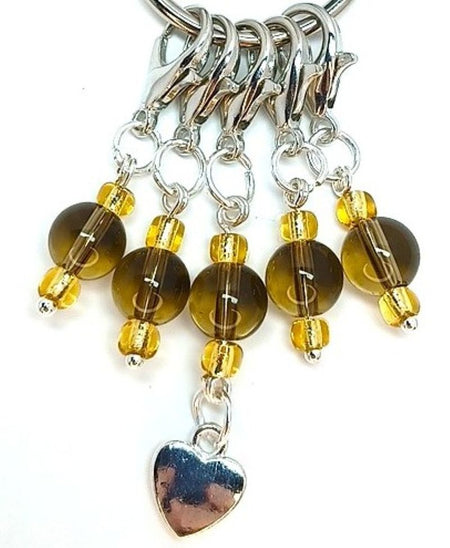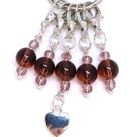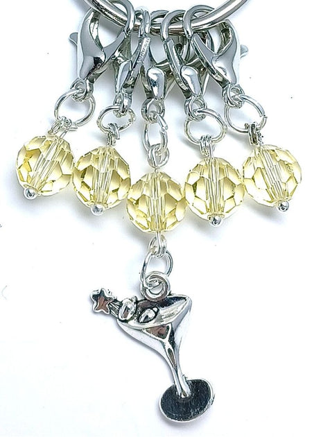 Set of 5 fine glass stitch markers on either rings or lobster clasps, one with an adorable charm to use as a focal or row-starting marker.