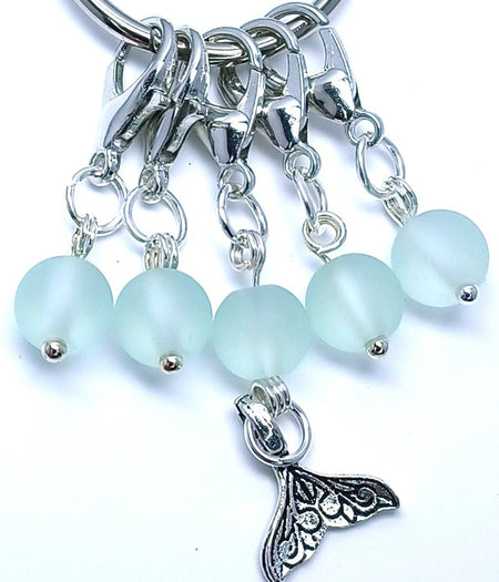 Set of 5 fine glass stitch markers on either rings or lobster clasps, one with an adorable charm to use as a focal or row-starting marker.