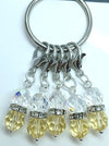 Set of 5 fine yellow and clear crystal stitch markers on silver rings or lobster clasps. The crystal reflects the light beautifully like suncatchers as you craft. Includes a ring for storage.  Add some elegance and whimsy to your knitting! Ships in a gift box for giving.