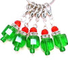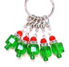 Set of 5 green holiday present fine glass stitch markers on silver rings that fit most knitting needles. The glass reflects the light beautifully like suncatchers as you craft. Includes a ring for storage.  Add some elegance and whimsy to your knitting! Ships in a gift box for gift giving.