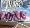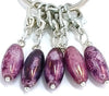 Set of 5 fine purple marbled glass stitch markers on silver rings or lobster clasps. The glass reflects the light beautifully like suncatchers as you craft. Includes a ring for storage.  Add some elegance and whimsy to your knitting!